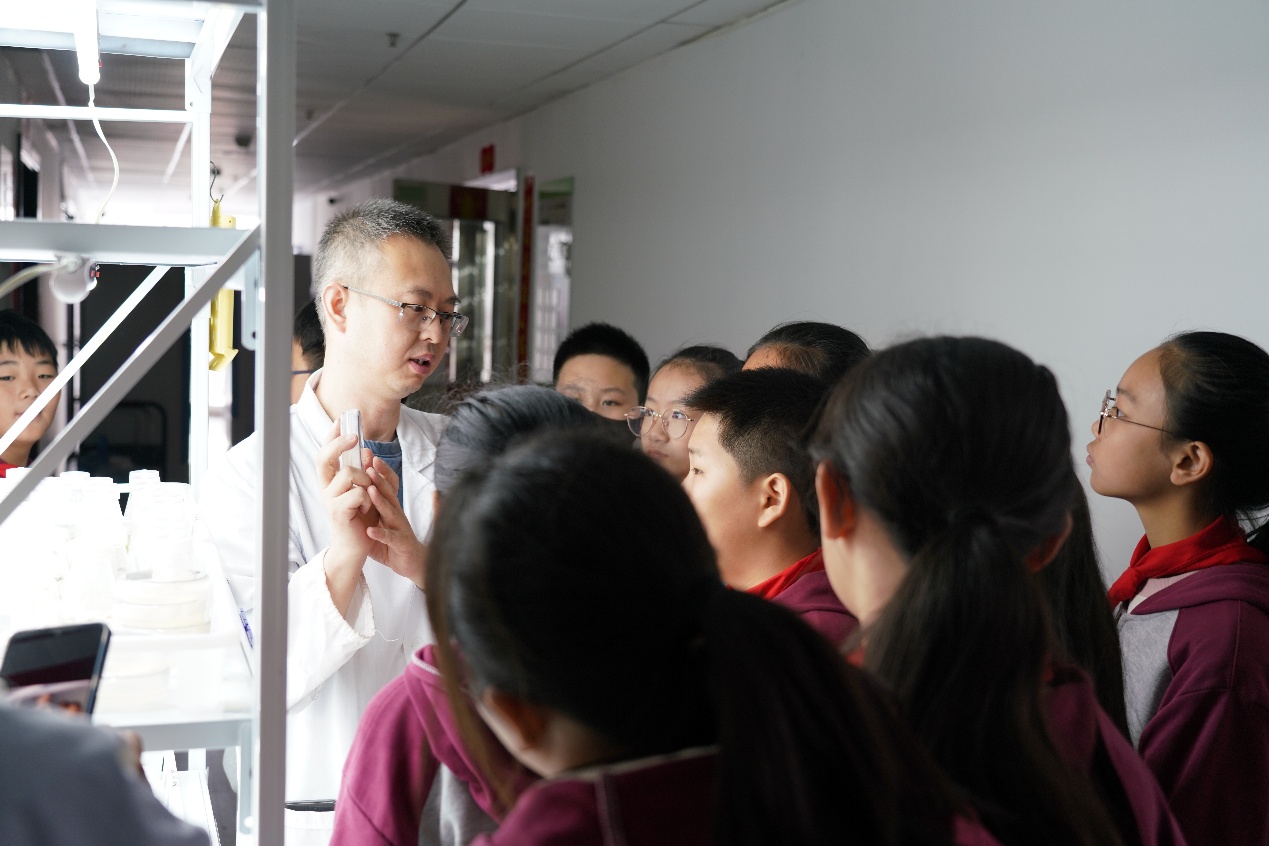 在组培间,张欢欢博士为孩子们揭开了“植物克隆”的奥秘:一颗草莓、一瓣大蒜,如何通过脱毒技术焕发新生,实现产量倍增。孩子们屏息凝神,注视着博士将一小片叶片置于“营养基”上,开启一场生命的奇迹之旅。随后走进人工气候室,仿佛步入了为幼苗量身打造的“理想家园”,恒定的温度、湿度和光照令大家连连惊叹。这趟直观的探访,让现代生物技术不再是抽象的概念,而是触手可及的生命魔法。