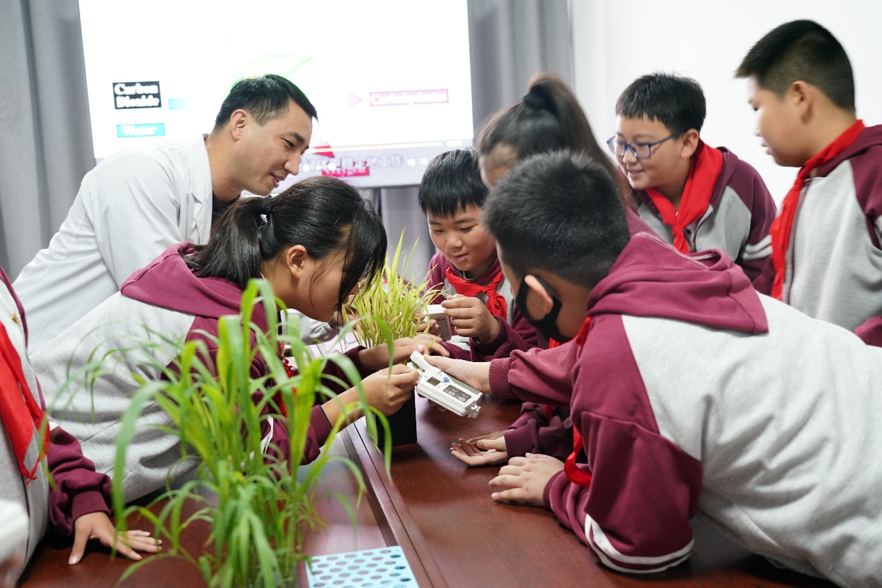 孟祥祥博士为学生们生动揭秘了植物“绿色工厂”的能源密码——光合作用。讲解了这一过程如何为作物生长提供能量,并现场指导学生使用叶绿素仪进行测定。当抽象的生物学原理转化为仪器屏幕上清晰可见的数据时,孩子们成功“测量”到了生命的律动,对光能转化有了最直观的理解。