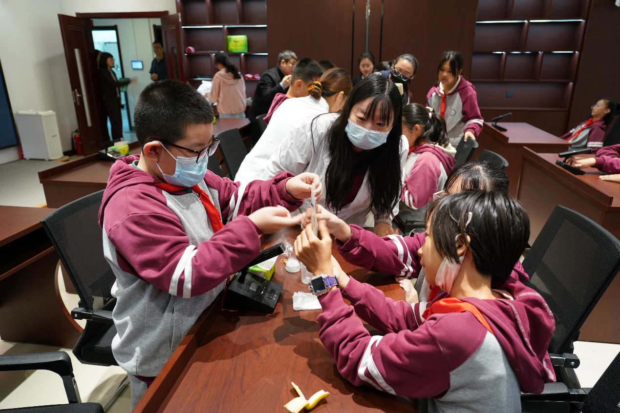最受孩子们欢迎的,当属动手实践环节。王西博士和张露丹博士带孩子们做香蕉DNA提取实验,利用洗洁精裂解细胞膜、盐析沉淀蛋白质、低温酒精析出DNA等步骤,将原本抽象难懂的DNA以一抹白色絮状物成功从香蕉泥中“揪”出来,孩子们惊叹不已,此时教科书上的螺旋图画变成了触手可及的奇妙存在。这个实验如同一把神奇的钥匙,为孩子们打开了一扇科学之门,让他们真切地体会到,高深的科学原理,就藏在我们触手可及的日常生活里。